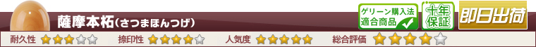 薩摩本柘は同じ柘材の中で最も品質が高く、経年変化も少ない印材です。当店は全て環境問題の栽培基準をクリアしたエコロジーな「薩摩本柘」を使用しております。「薩摩本柘」は高級印材でありつつ他の印材と比べて最も安価で、木目の美しさが魅力な印材です。衝撃に弱いので、印鑑ケースとセットでのご購入をお勧めします。